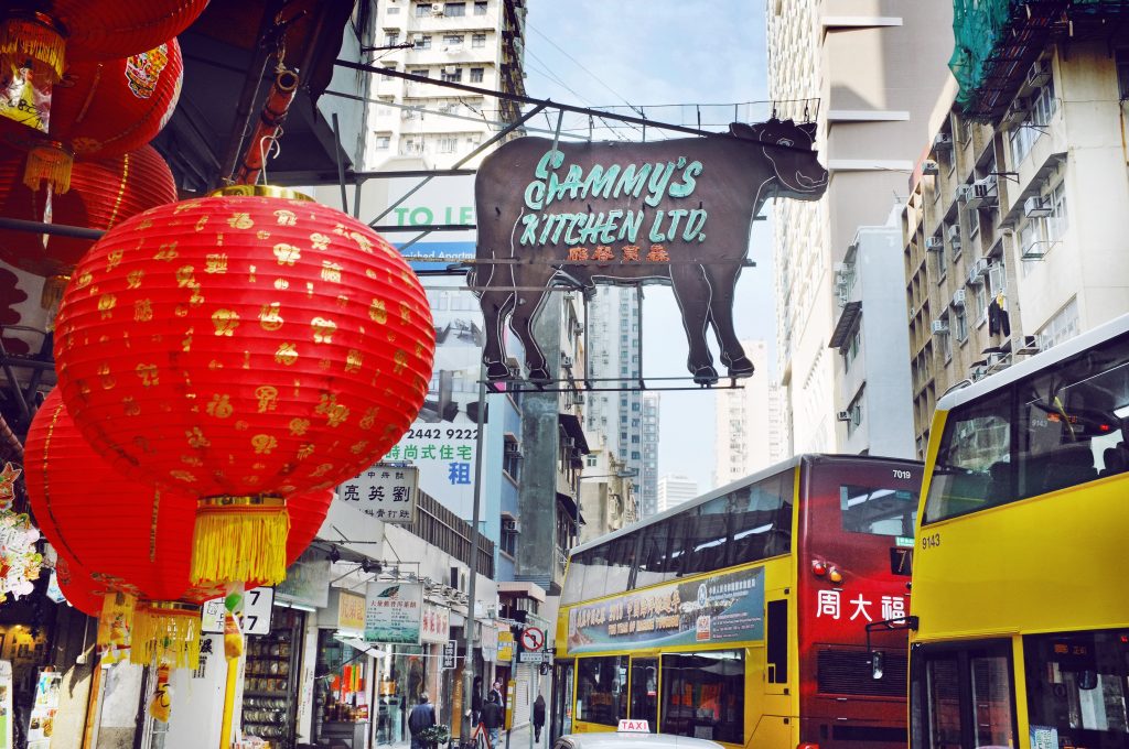 “Every inch of space was used. As the road narrowed, signs receded upwards and changed to the vertical. Businesses simply soared from ground level and hung out vaster, more fascinatingly illuminated shingles than competitors. We were still in a traffic tangle, but now the road curved. Shops crowded the pavements and became homelier. Vegetables, spices, grocery produce in boxes or hanging from shop lintels, meats adangle – as always, my ultimate ghastliness. And markets everywhere. To the right, cramped streets sloped down to the harbor. To the left, as we meandered along the tramlines through sudden dense markets of hawkers’ barrows, the streets turned abruptly into flights of steps careering upwards into a bluish mist of domestic smoke, clouds of washing on poles, and climbing. Hong Kong had the knack of building where others wouldn’t dare.”