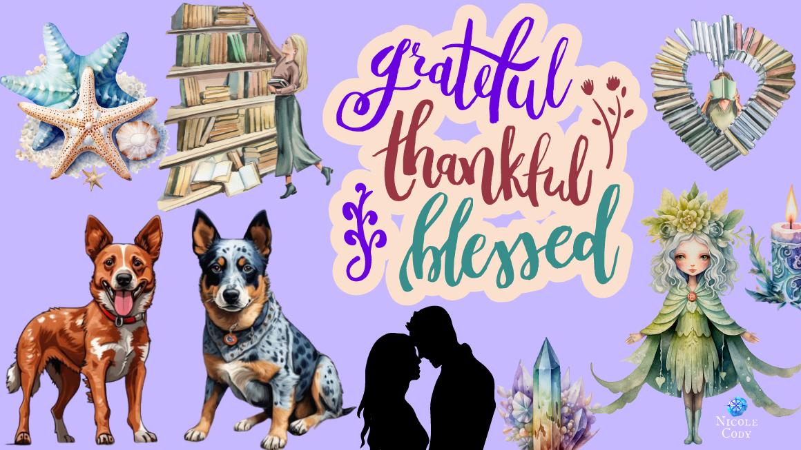 My relationship, and the wonderful friendship and support I have from family and community, including YOU, lovely. Thank you for sharing this journey with me💕 . Our two gorgeous pupsters, Harry (Blue Cattle Dog) and Rufous (Red Cattle Dog). My fairy friend Sokli, my Guides, and my ‘working crystal’ collection, our new bookcases and the multitude of books for which we are currently custodians, winter sunshine, Spotify playlists that soothe me or provide the right energy for writing, living so near the beach in our beautiful treehouse, cups of tea and mugs of good decaffeinated coffee, our Treehouse and its leafy green outlook – goodness, so many things.