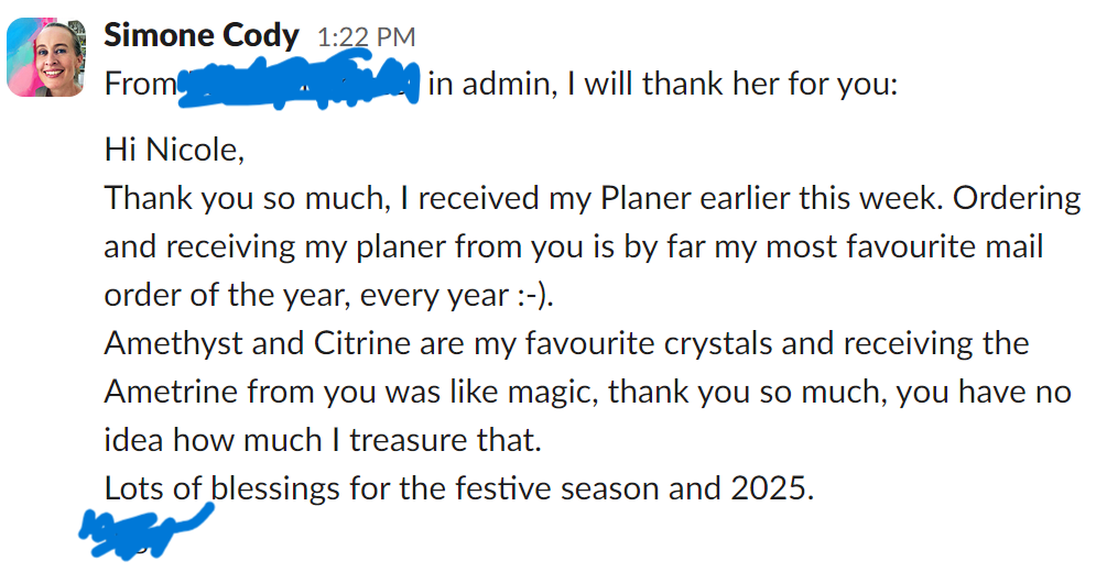 I put love and magic into every order – especially at Christmas time. I realised some time ago that for many of my community, my Planner and anything else they bought from me might be the only gift they received. So I make sure that if you buy from me I treat your order as if I was sending it to a dear friend or family member. I gift wrap your purchase, add a note, and a little something extra as a surprise.
