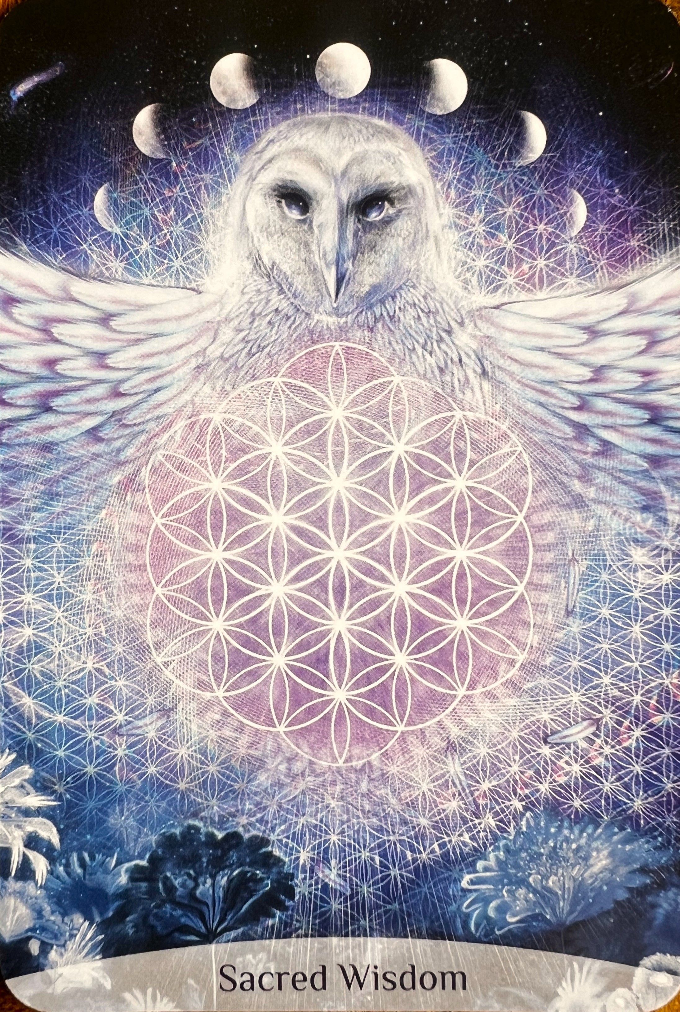 This week’s oracle card, Sacred Wisdom, comes to us in the form of a watchful white owl, her wings wide, her heart radiant with sacred geometry, and the phases of the moon glowing gently behind her. She’s a still, powerful presence. And she brings a message: